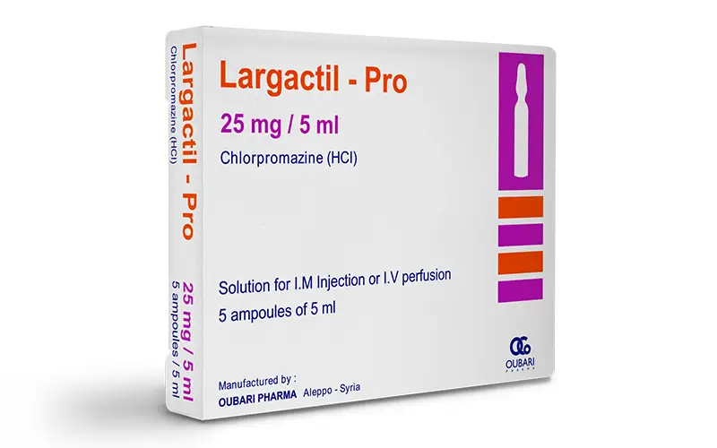 لارجاكتيل – برو 25 ملغ / 5 مل، وهو دواء ينتمي إلى زمرة الفينوثيازينات (فئة الأدوية العصبية)، يستخدم بشكل أساسي لعلاج مجموعة وسعة من الاضطرابات العصبية التي تؤثر على الجهاز العصبي المركزي، بالإضافة إلى الاضطرابات التي تؤثر على الجهاز الهضمي، كما ويستخدم لعلاج حالات معينة من الاضطرابات التي تؤثر بالمجرى الدموي.